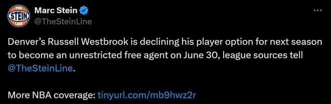 根据名记Stein报道,根据合同规则威少需要在6月30号之前决定是否执行球员选项,如今他决定拒绝下赛季价值346万美元的球员选项,彻底恢复自由身。
