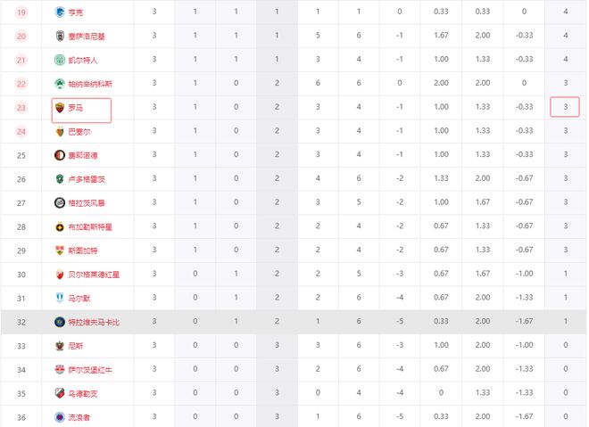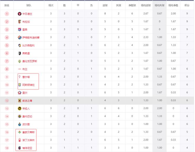 积分榜方面,随着维拉、罗马爆冷输球,贝蒂斯也无力赢球,本轮过后英超、西甲和意甲竟无一队能挤入前8,法甲和德甲则是各有一队进前8,里昂3连胜排在第3,弗赖堡2胜1平排在第6。中日德兰3连胜,1个净胜球优势力压布拉加和里昂领跑。惨遭逆转的维拉2连胜被终止,排名跌到第10,排在塞尔塔之后。贝蒂斯第16,诺丁汉森林第17,意甲两强更惨,博洛尼亚排在第18,罗马第23。