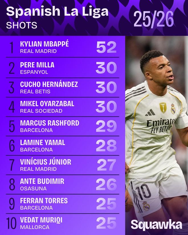 北京时间10月29日,知名数据平台Squawka列出了本赛季西甲联赛中射门次数最多的球员榜单。皇马球星姆巴佩凭借52次射门高居榜首。在欧洲五大联赛中,姆巴佩的射门次数比第二名哈兰德(37次)多出了15次。