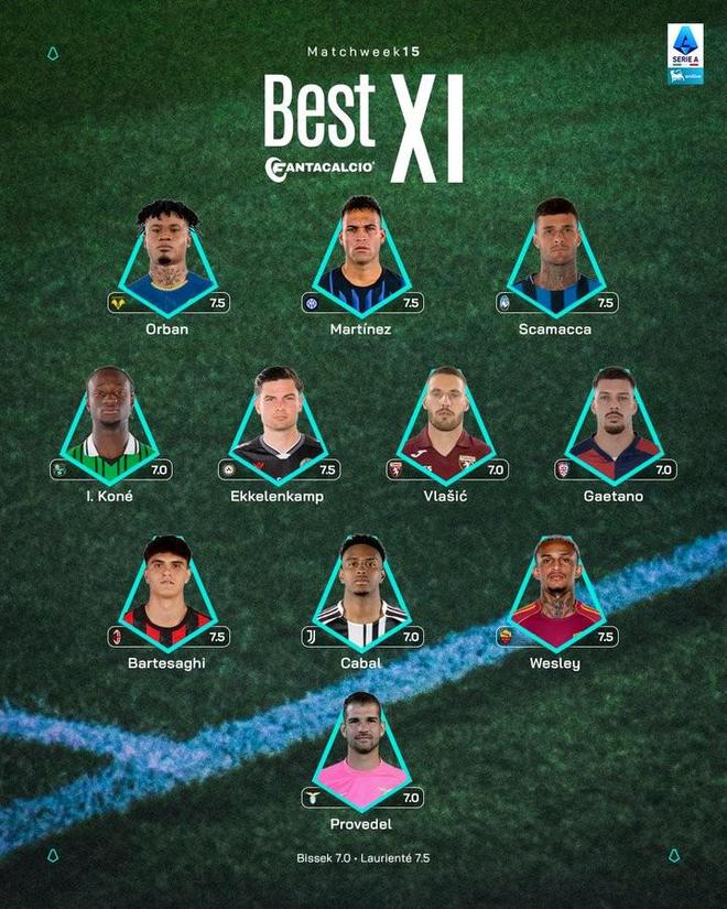 中场:伊斯梅尔-科内(萨索洛)、埃克伦坎普(乌迪内斯)、弗拉希奇(都灵)、加埃塔诺(卡利亚里)